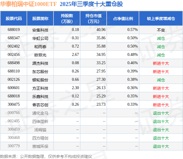 从基金边界来看,华泰柏瑞中证1000ETF基金2025年三季度公布的基金边界为0.72亿元,较上一期边界8132.97万元变化了-921.34万元,环比变化了-11.33%。该基金最新一期钞票成立为:股票占净值比90.78%,债券占净值比0.01%,现款占净值比8.26%。从基金合手仓来看,该基金当季前十大股票仓位达4.32%,第一大重仓股为安集科技(688019),合手仓占比为0.57%。