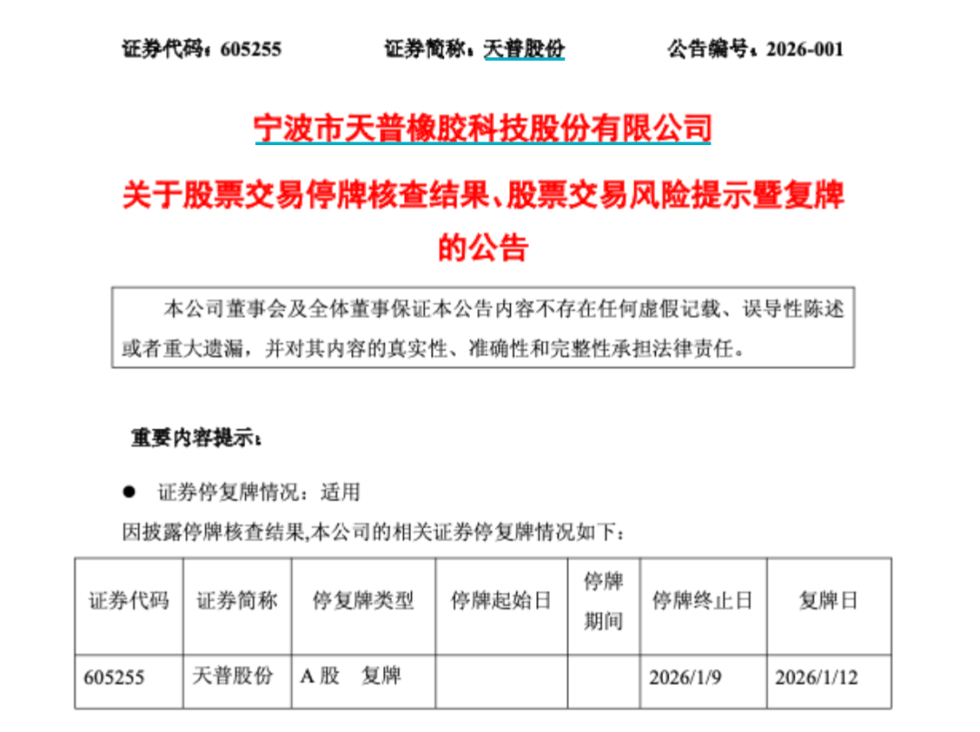 1月9昼夜深,天普股份(605255)发布了股票交往停牌核查效果,公司股票于2026年1月12日(星期一)开市起复牌。